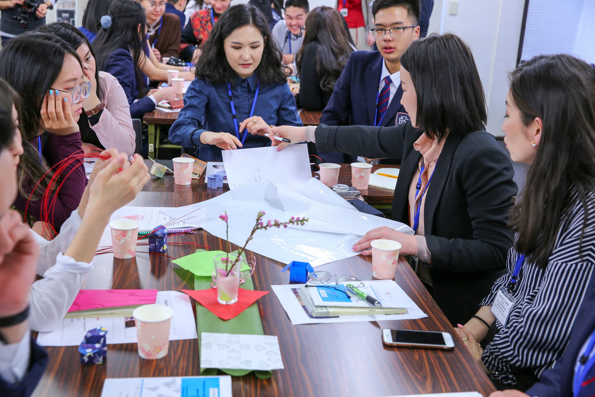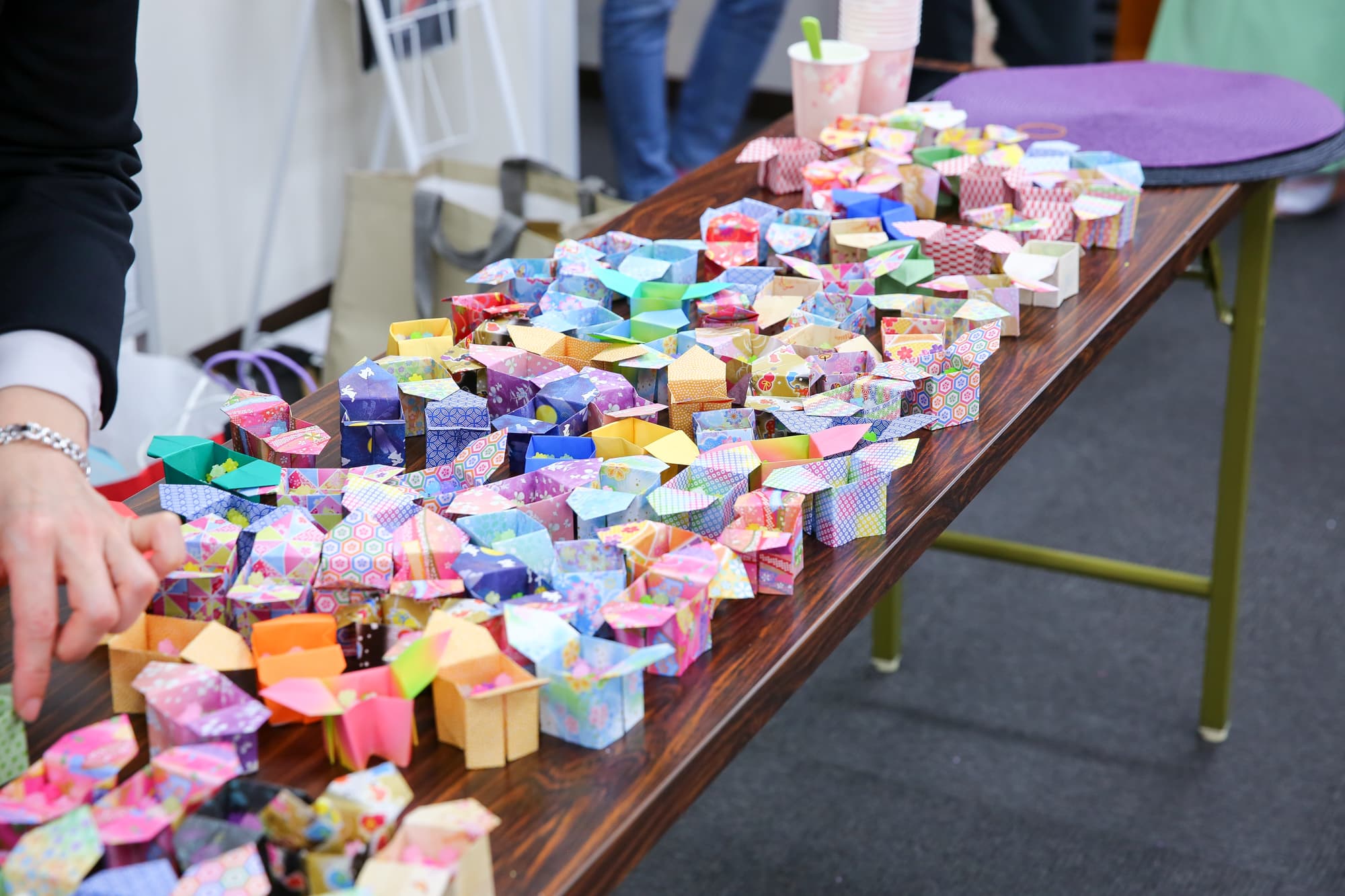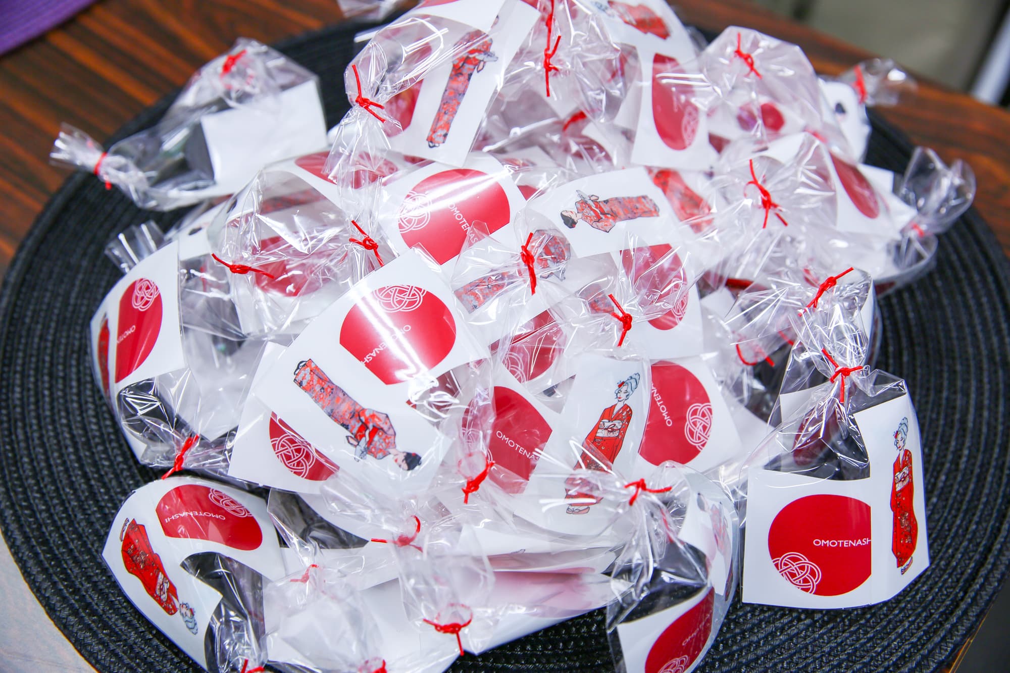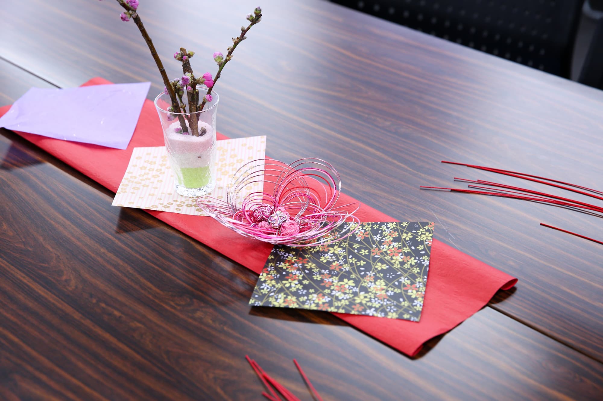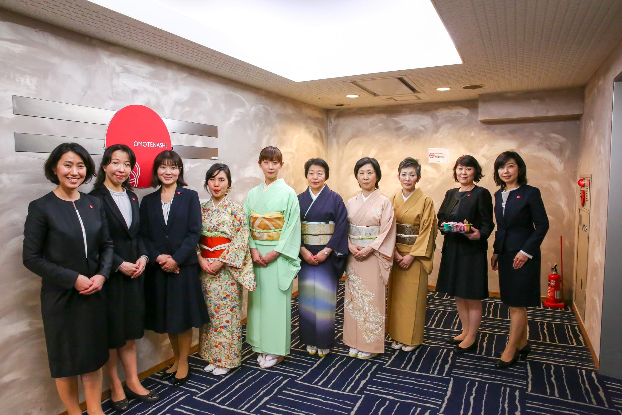 着物姿の日本文化講師がお出迎え、桃の花、水引、折り紙でしつらえられた日本の春を感じる空間で、おもてなしの専門的な知識とスキルを持つおもてなしコンシェルジュが、金平糖とお茶でおもてなし。