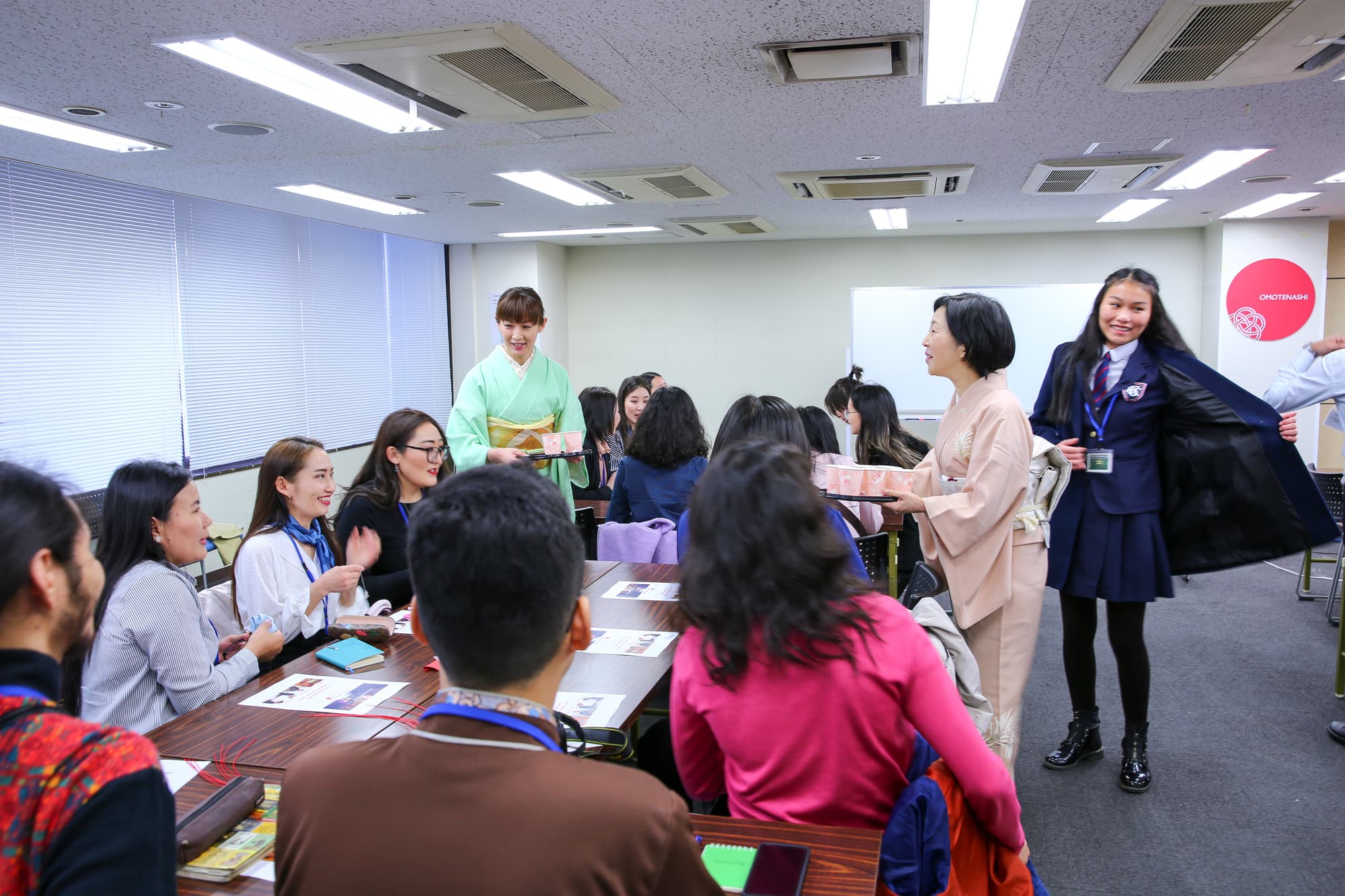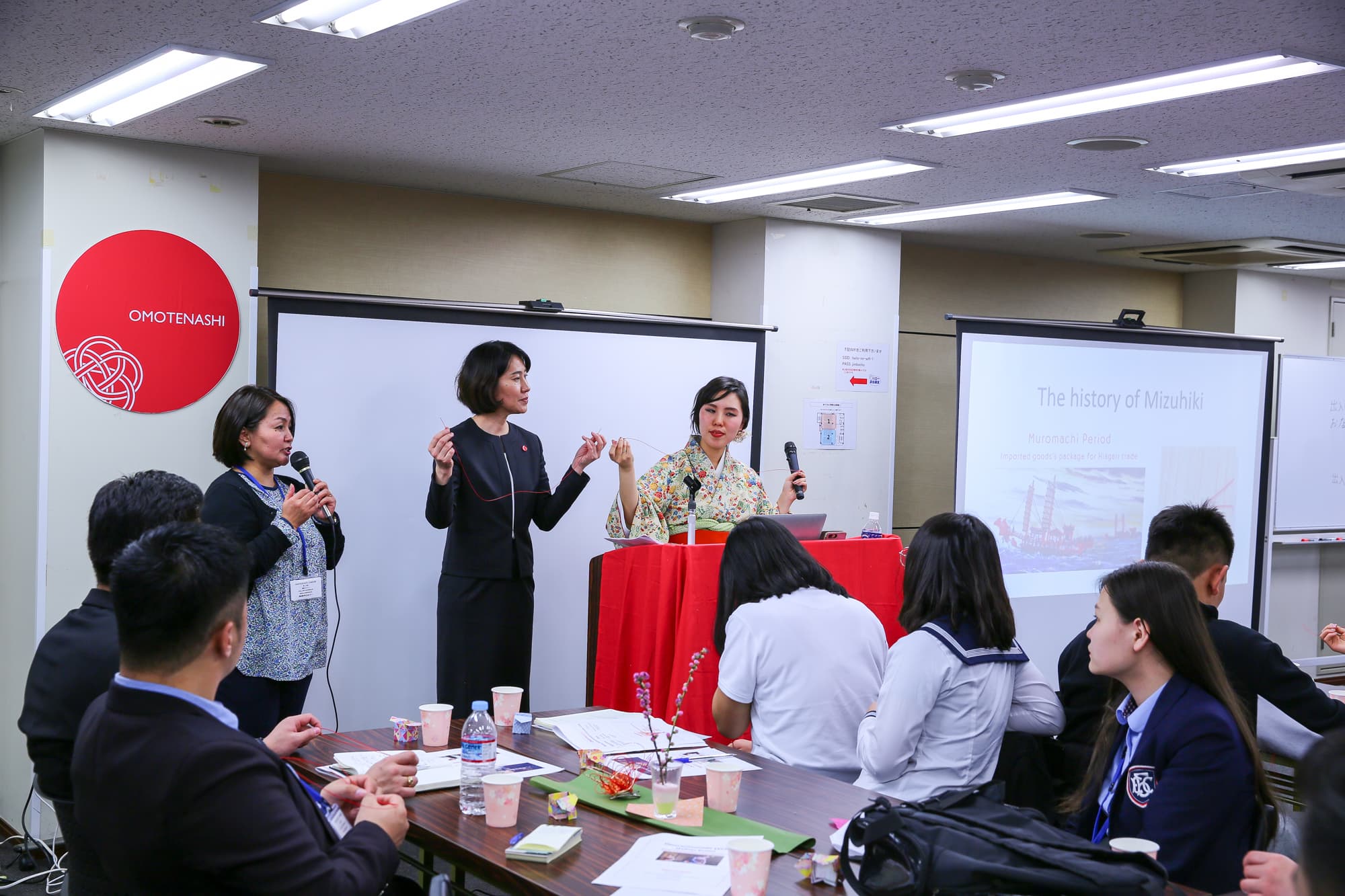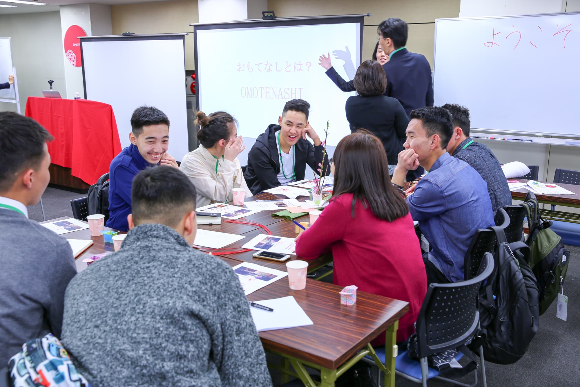 おもてなしについて、プロジェクターによる講義や受講者への問いかけ、ディスカッション、質疑応答を通し、理解を促進。日本独自の挨拶やお辞儀、物の受け渡しを実演・実践し、日本独自のおもてなしの方法を学んだ。