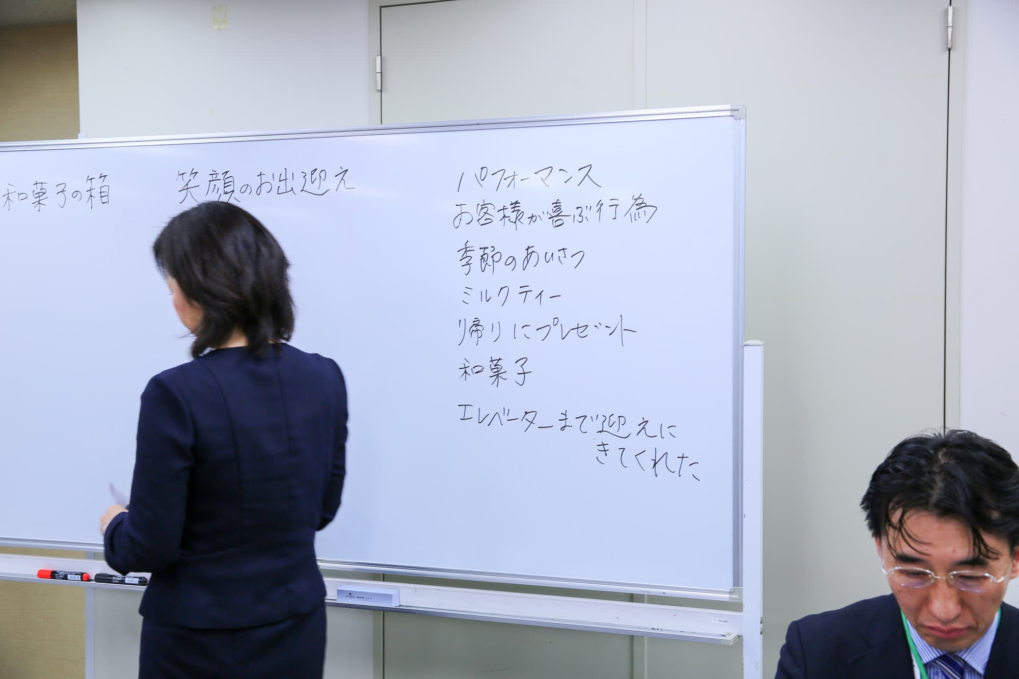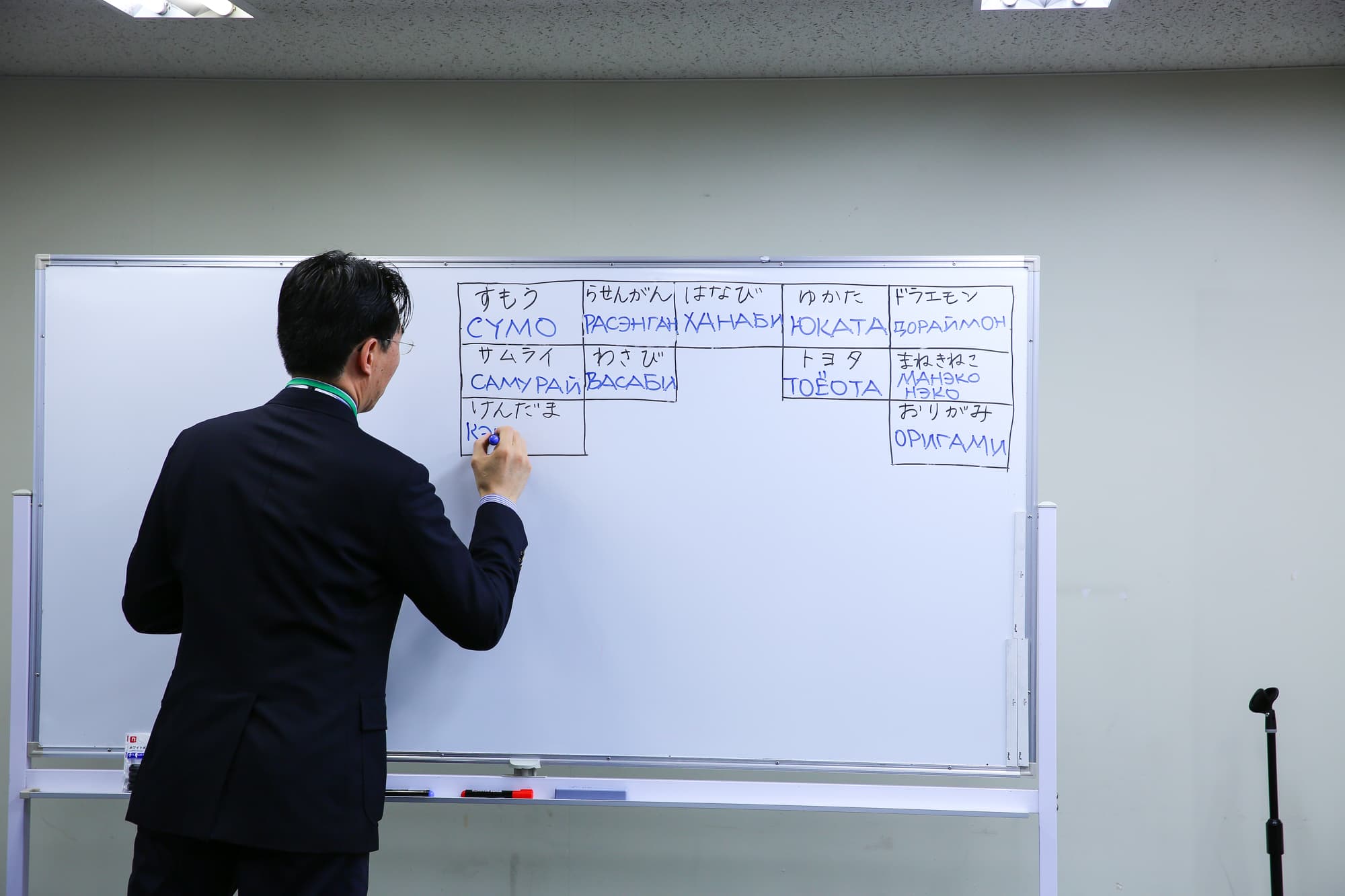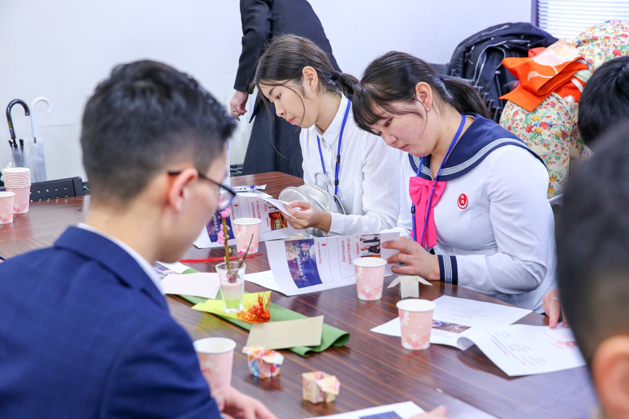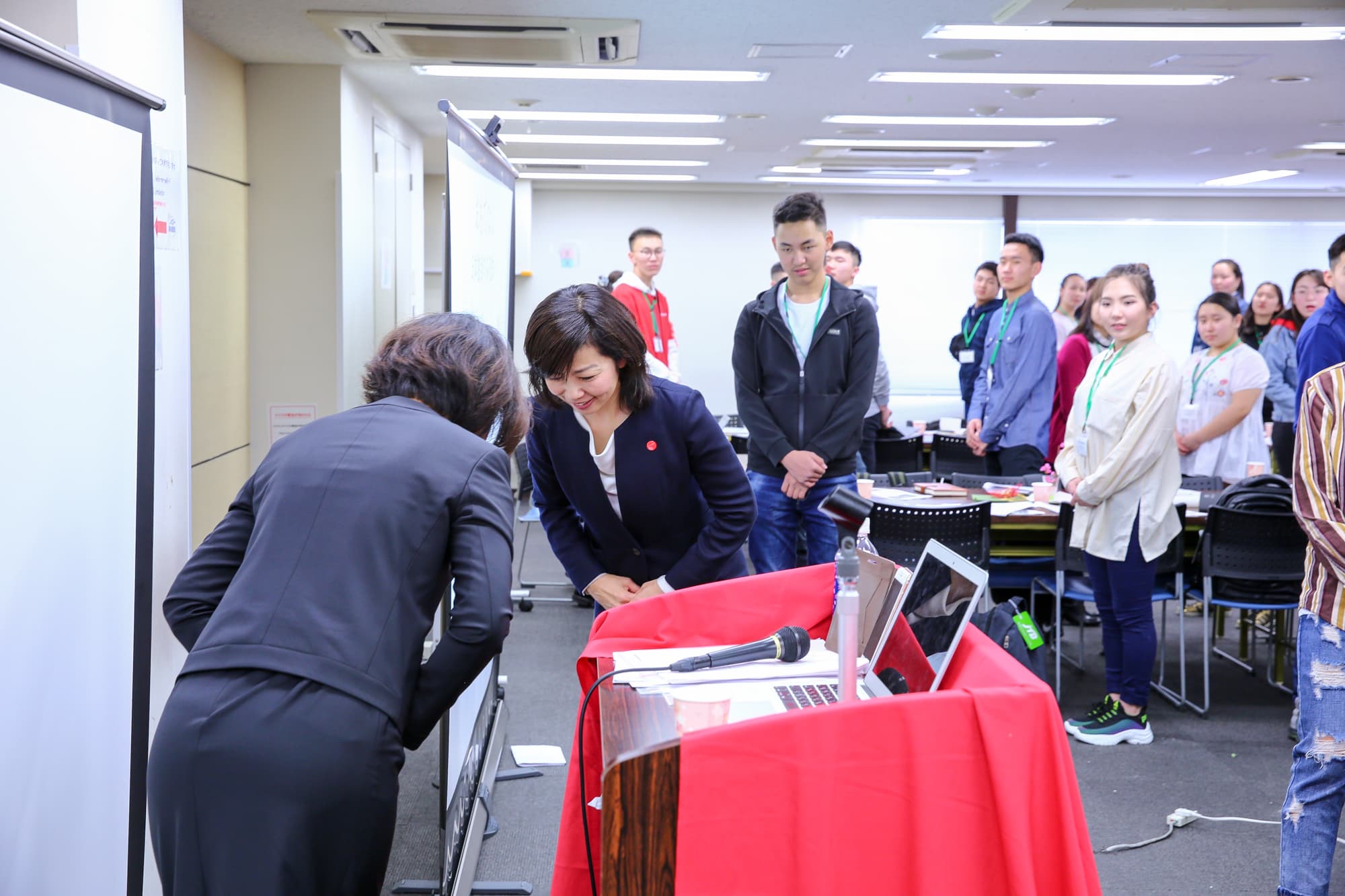 おもてなしについて、プロジェクターによる講義や受講者への問いかけ、ディスカッション、質疑応答を通し、理解を促進。日本独自の挨拶やお辞儀、物の受け渡しを実演・実践し、日本独自のおもてなしの方法を学んだ。