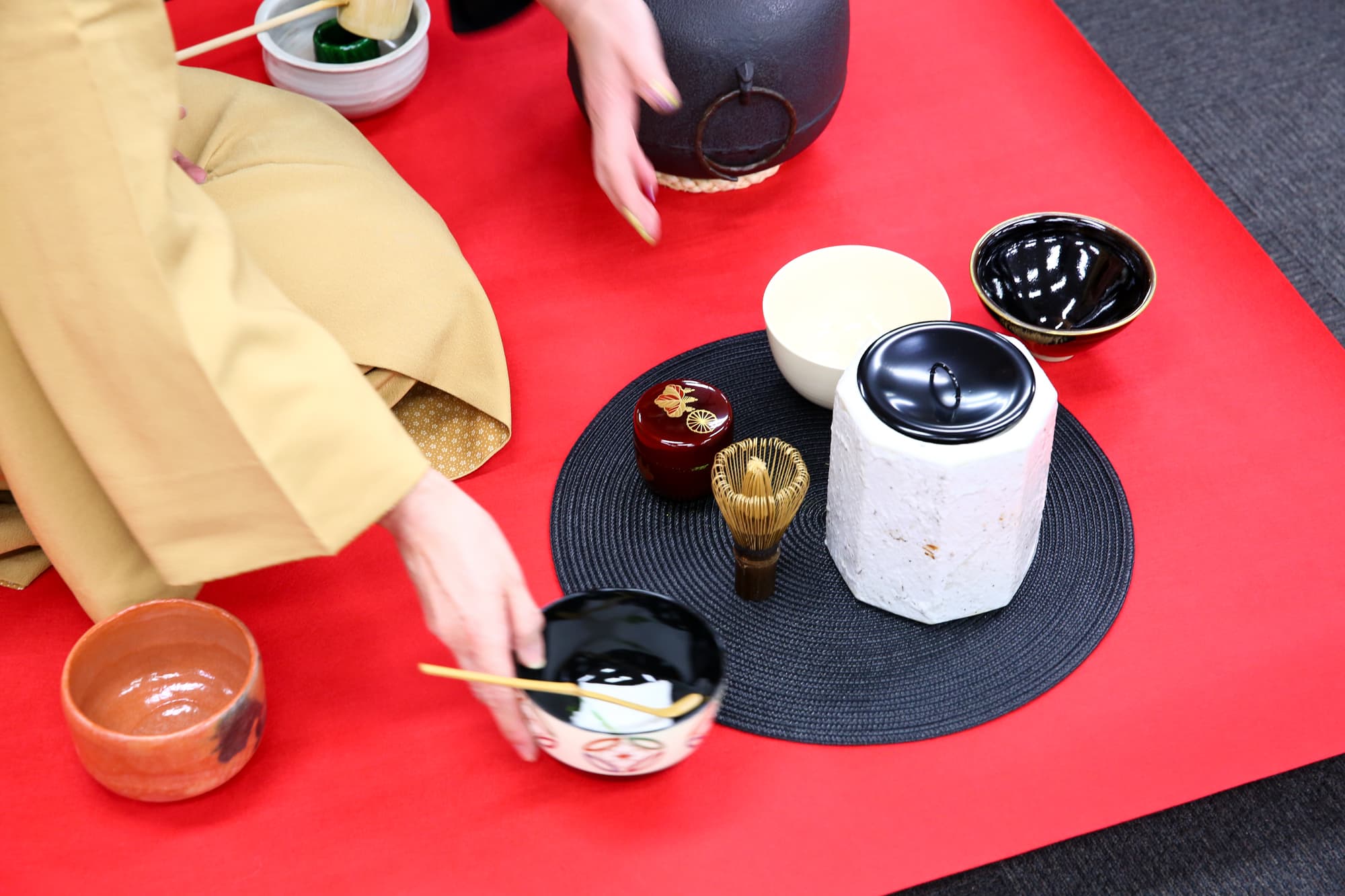 おもてなしの源流、茶道を体験。会議室の一角に設置した点前スペースで、お点前を披露。茶道講師が5名のモンゴルの方へ1杯ずつ抹茶を点てた。