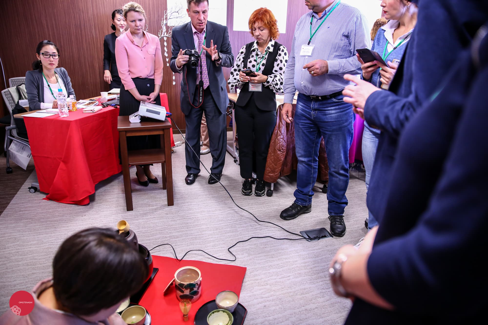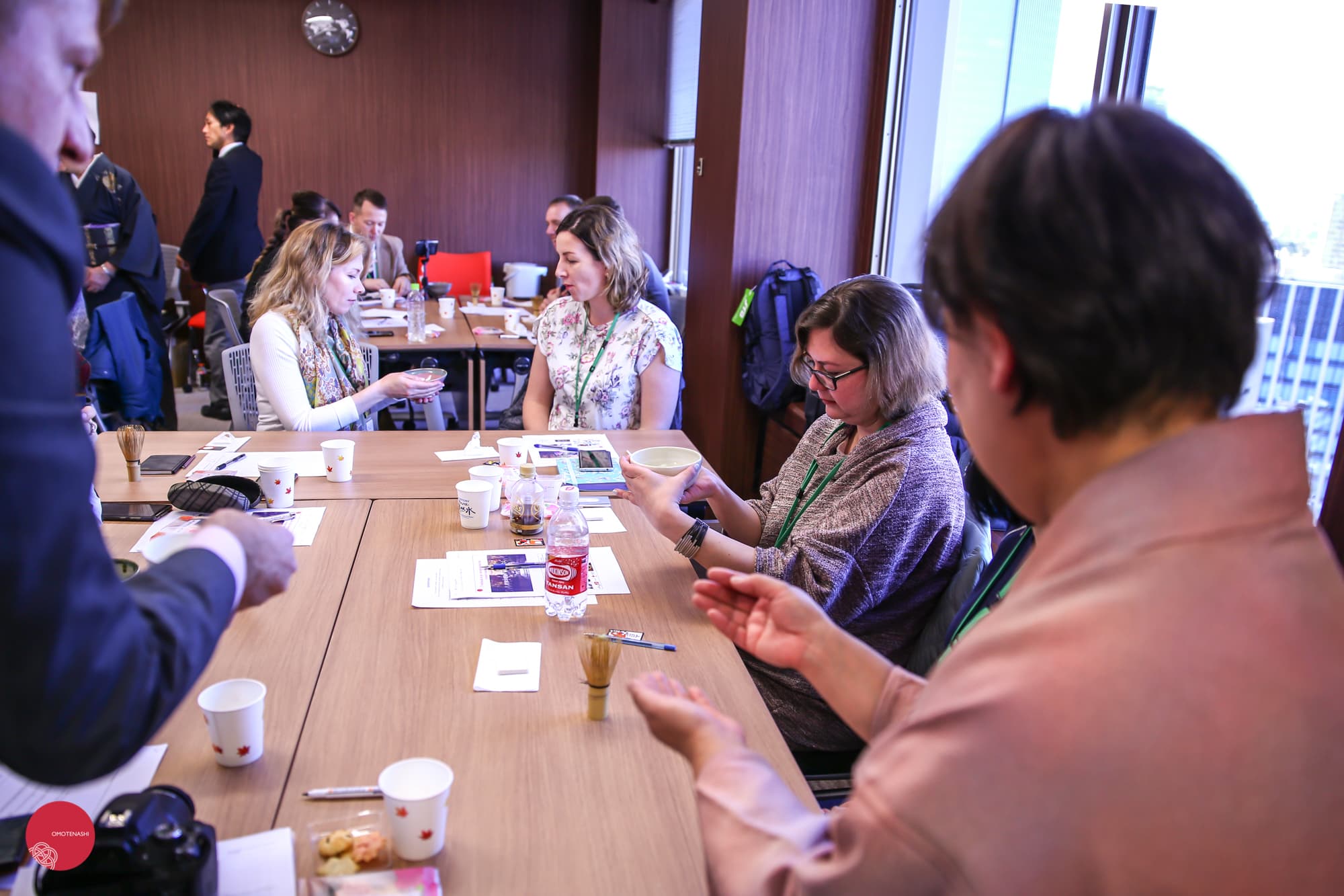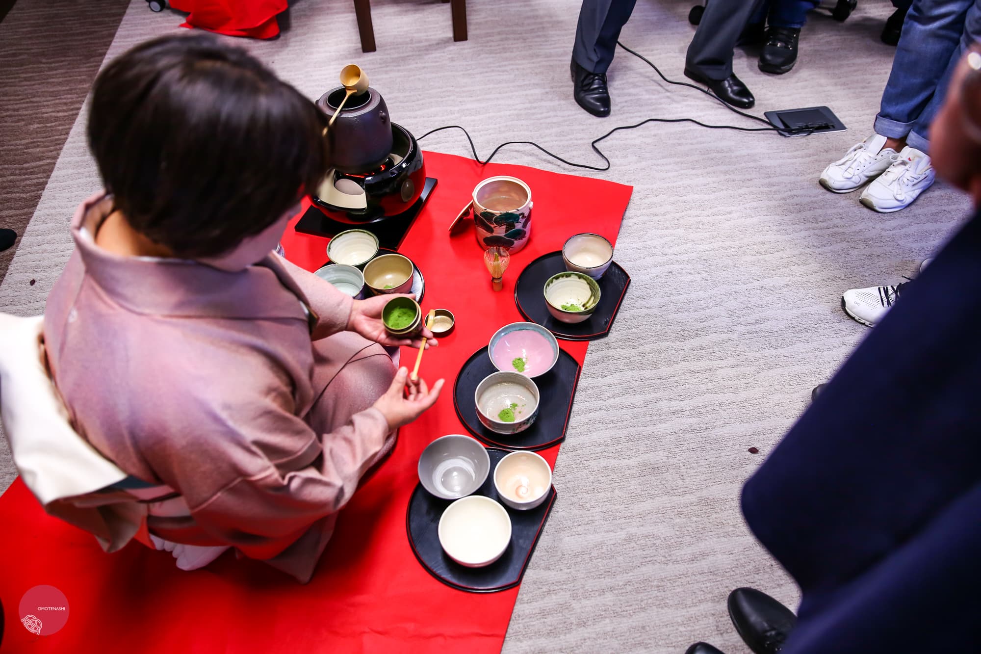 会議室の一角に点前スペースを設置し、裏千家助教授が点前を実演。おもてなしの源流である茶道(10名が茶筅でお茶の点て方、10名がお点前のいただき方)をそれぞれに体験して頂き、おもてなしの心を実感。