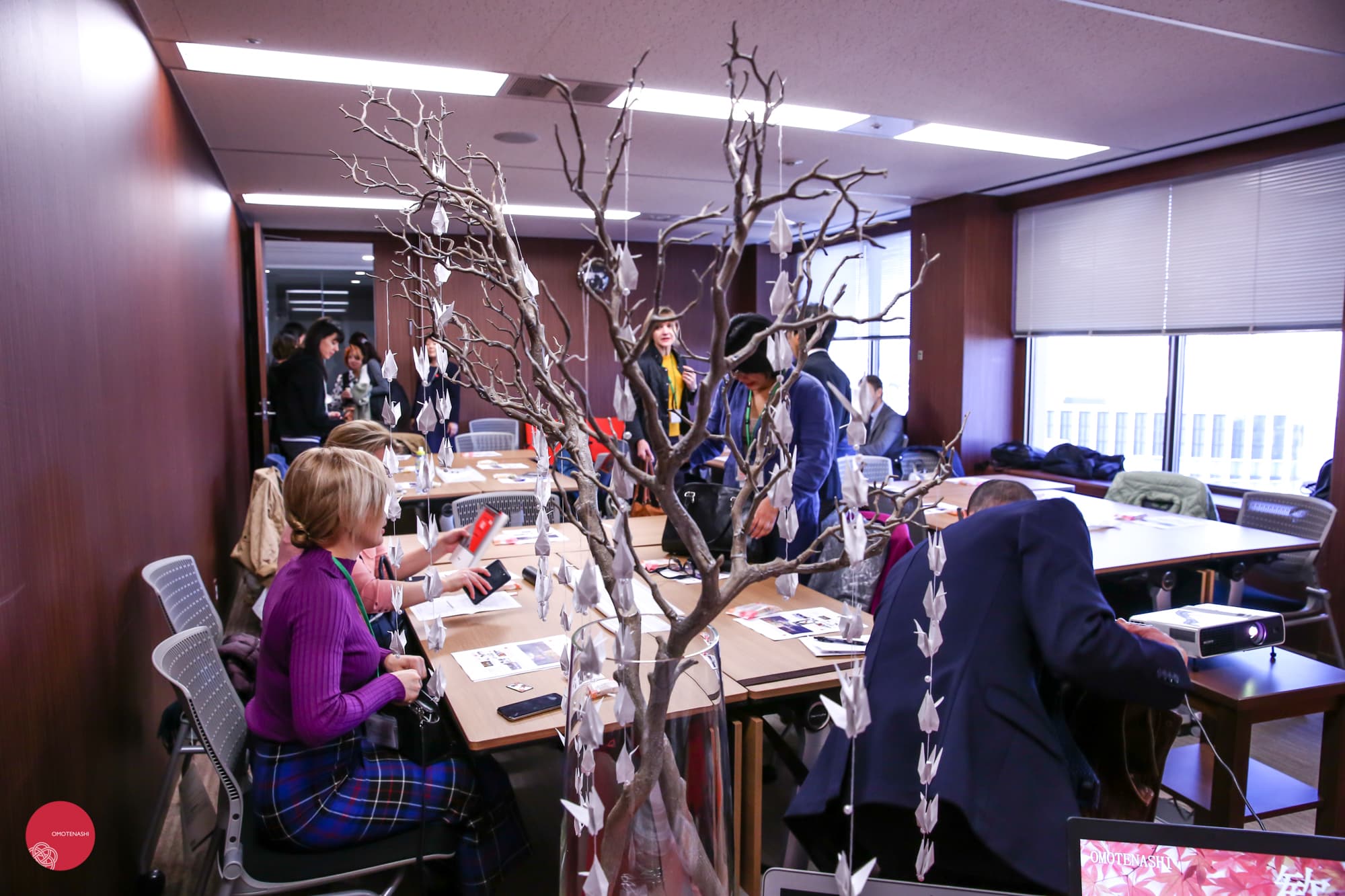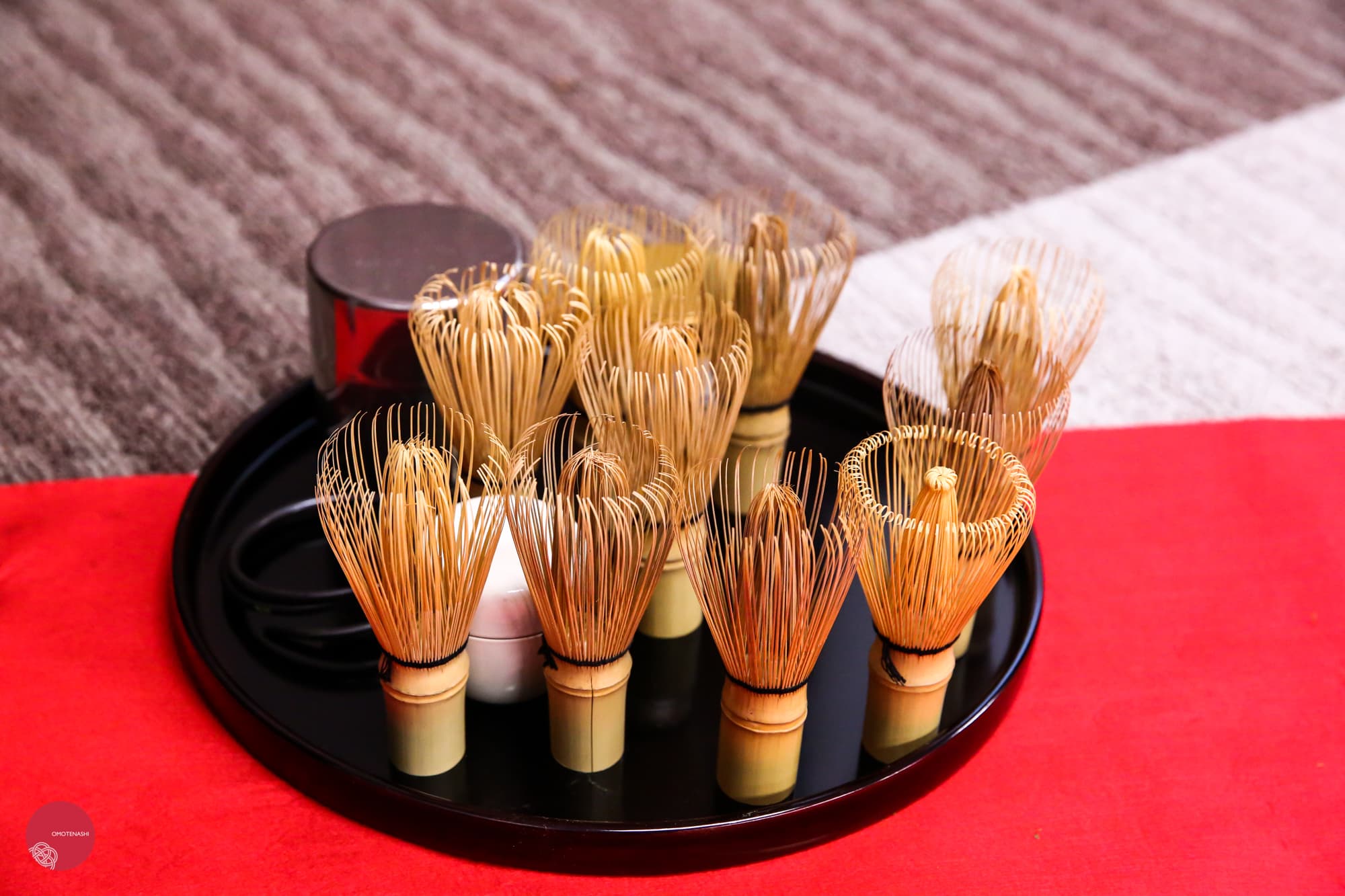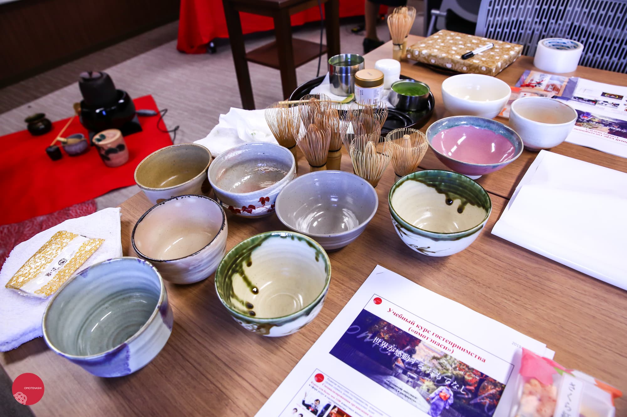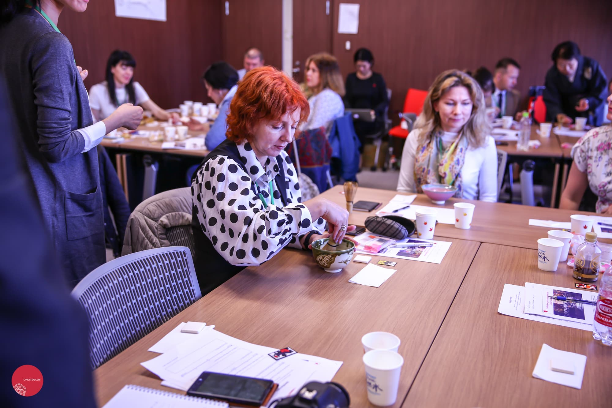 会議室の一角に点前スペースを設置し、裏千家助教授が点前を実演。おもてなしの源流である茶道(10名が茶筅でお茶の点て方、10名がお点前のいただき方)をそれぞれに体験して頂き、おもてなしの心を実感。