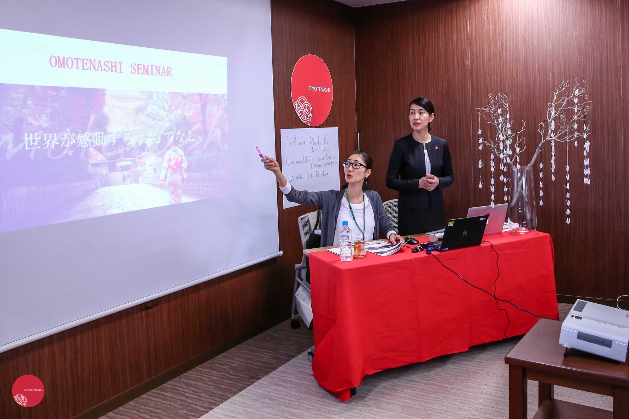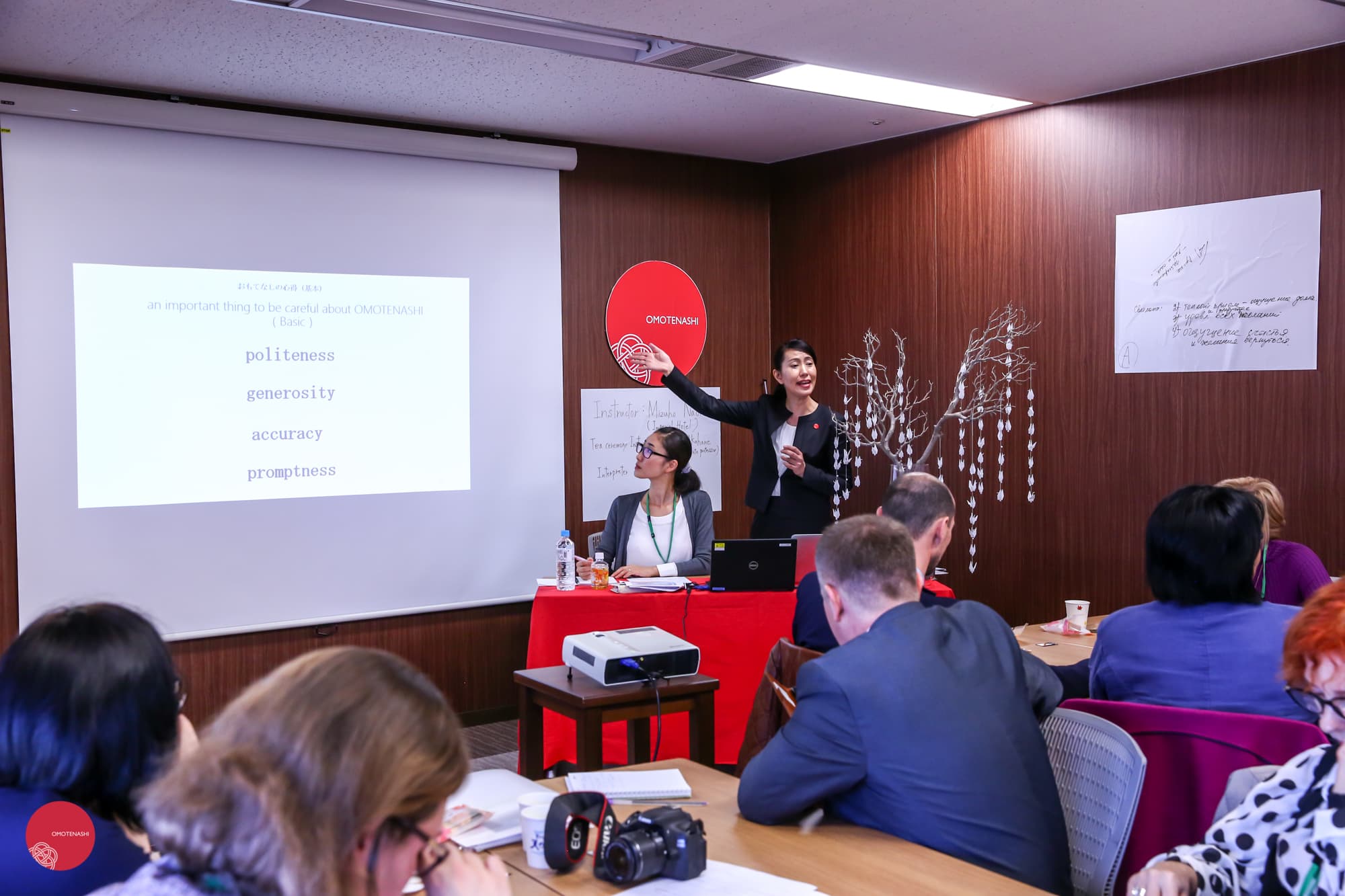 おもてなし(日本独自のホスピタリティ)の特徴・おもてなしの要素・世界から賞賛されるおもてなしについて、プロジェクターによる講義や動画による所作の解説、受講者への問いかけ、質疑応答を通し、おもてなしについての理解を促進。